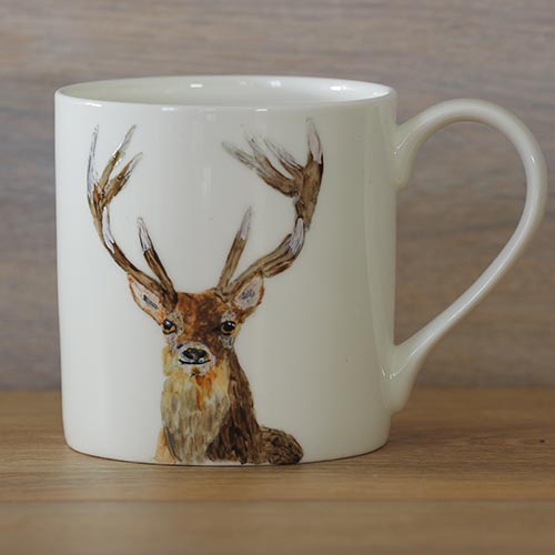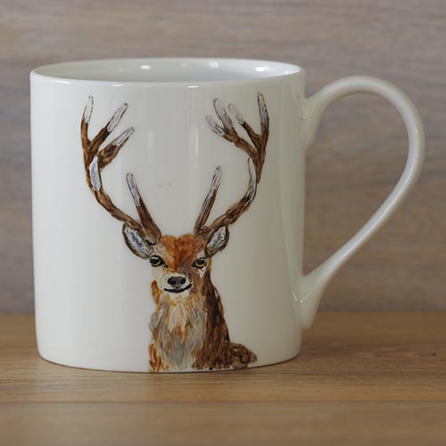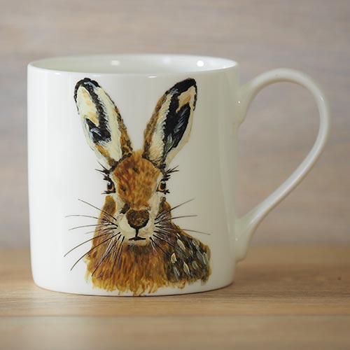 Each Exmoor stag mug is unique. Working from one of my photographs I paint the mugs in batches of about 6 so that there is consistency in the colours of the hares. With the paint, I build layers of colour which creates texture on the mug and adds to their vibrancy. The paints are ceramic and once dry are baked in the oven to cure the paint which makes them dishwasher proof. The mugs we are using are beautifully thin bone china, just right for a lovely cup of tea or coffee.  These hares are all on our classic Balmoral stock which gives you a large tea mug. To see more information and compare sizes link here.