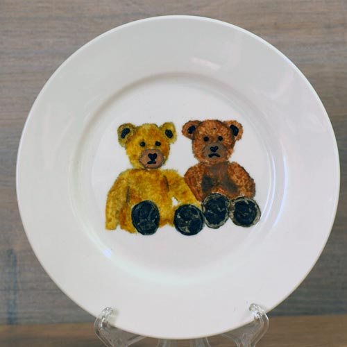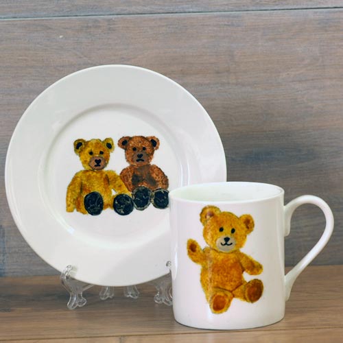 I thought I would paint my own teddy who is now over 50 years old but she turned out to be rather battered. There are two teddies on this mug, slightly different and each a different colour. I started with teddies when I wanted to make my granddaughter a birth present that she could use or keep. I look back at the cup and laugh, it was one of my first and it’s not very good, I’ll do another one of these days. I think these are lovely for children and you can get the plate to go with them. They are perfect for customing. If you have an old teddy I could paint that for you on your mug if you take a photograph See customising a mug