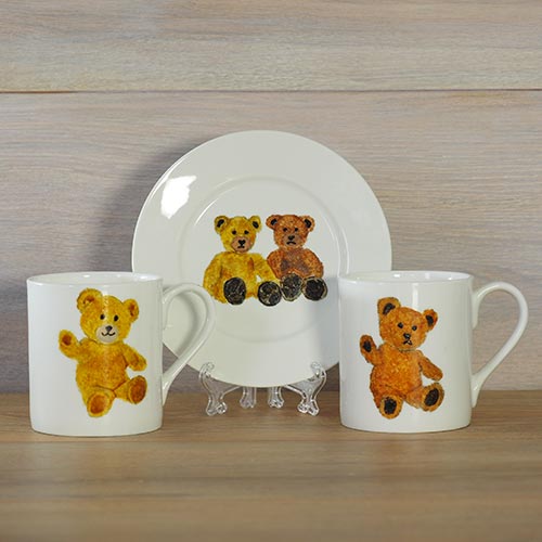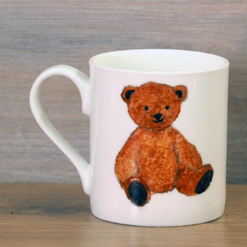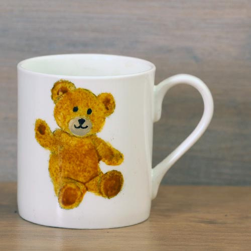 Each teddy mug is unique. Working from one of my photographs I paint the mugs in batches of about 6 so that there is consistency in the colours of the teddies. With the paint, I build layers of colour which creates texture on the mug and adds to their vibrancy. The paints are ceramic and once dry are baked in the oven to cure the paint which makes them dishwasher proof. The mugs we are using are beautifully thin bone china, just right for a lovely cup of tea or coffee. These teddies are all on our small Balmoral stock which gives you a small cup of tea or coffee and is perfect for our children’s range. To see more information and compare sizes link here.
